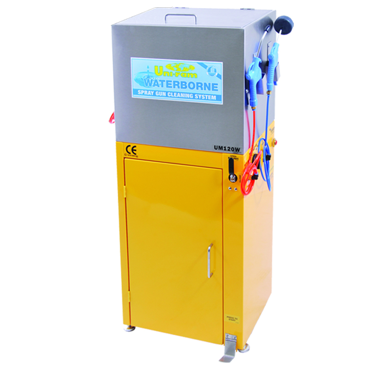 The UM120A waterborne spraygun cleaner is equipped with cleaning tools to clean paint from the spraygun, wash gun delivers high pressure water to clean the paint channel, this unit features a water recovery system.